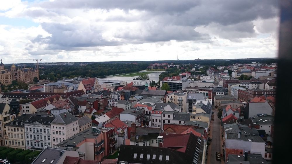 Ausblick vom Domturm, im Vordergrund die Altstadt im Hintergrund das Gelände der BUGA 2009 in Schwerin.