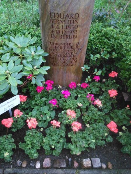In unserem Friedenau liegt das Grab von Eduard Bernstein auf dem Friedhof Eisackstraße am Innsbrucker Platz. Der Friedhof ist seit 2006 aufgelassen, immer weniger Blumenschmuck sieht man auf den Gräbern. Dafür wird das Grab von Eduard Bernstein von unserer Abteilung von den Bernstein-Patinnen Ingeborg Ludwig, Eva Liebchen, Dorothee Mortensen und Gudrun Blankenburg seit 2013, dem 150. Jubiläumsjahr der SPD zweimal im Jahr mit frischen Blumen und Grün bepflanzt. Immer liegen auch Steine auf dem Grab zum Gedenken an den jüdischen Eduard Bernstein.