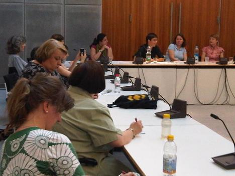 Dr. Stephanie Bock, Frauenbeirat für Stadtentwicklung, und Regula Lüscher, Senatsbaudirektorin, beschrieben zunächst, was Gender Mainstreaming in der Stadtplanung bedeutet, um dann die bisherigen Planungsschritte für das Tempelhofer Feld darzustellen. In der Diskussion stellte sich heraus, dass bisher Gender Mainstreaming kein Kriterium in der Ausschreibung der Projekte war. Auch ist in der Jury zur ersten Projektauswahl für die Gestaltung des Tempelhofer Feldes keineR ExpertIn für den Bereich Gender Mainstreaming vertreten.