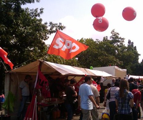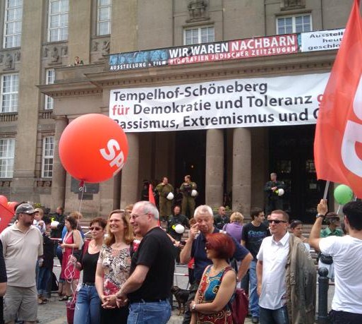 Weit mehr als 1000 Berlinerinnen und Berliner kamen am Samstag, den 17.07. zum Rathaus Schöneberg, um gegen den zeitgleich im Rathaus stattfindenden Parteitag der rassistischen Bewegung „Pro Deutschland“ zu demonstrieren. Zu den Protesten hatte ein breites Bündnis aus Parteien, Gewerkschaften, Vereinen und Initiativen aufgerufen. Bereits am Vortag rief auch der Regierende Bürgermeister Klaus Wowereit zur Unterstützung auf. "Fremdenhass, Rassismus und Sozialdarwinismus haben in Berlin keinen Platz. Auch Organisationen scheinbar weichgespülter Rechtsextremer wie "Pro Deutschland" dürfen bei uns auf keinen Fall Fuß fassen."", erklärte Wowereit.